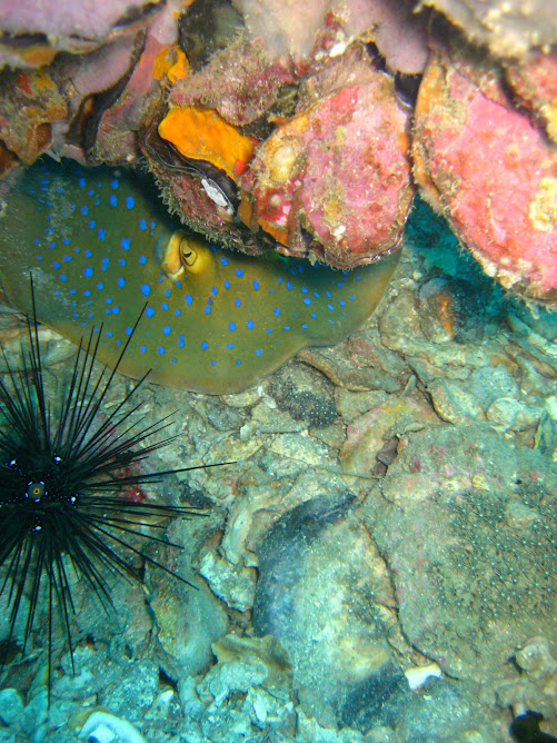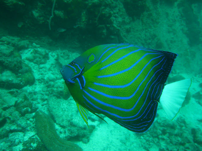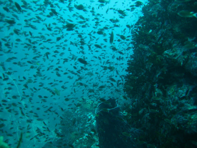 C'est le gros poisson au milieu. On l'avais vu ensemble avec Ju la premiere fois. Il nous avait fonce dessus et Julien s'etait moque de moi par ce que j'avais peur. Quand il a fait son stage de plongee, il a appris qu'il fallait s'en mefier car des fois il attaque et mord. Il est capable de trouer une palme et il y a deja eu des blesses! Et oui, les poissons ca mort!!!!!!!